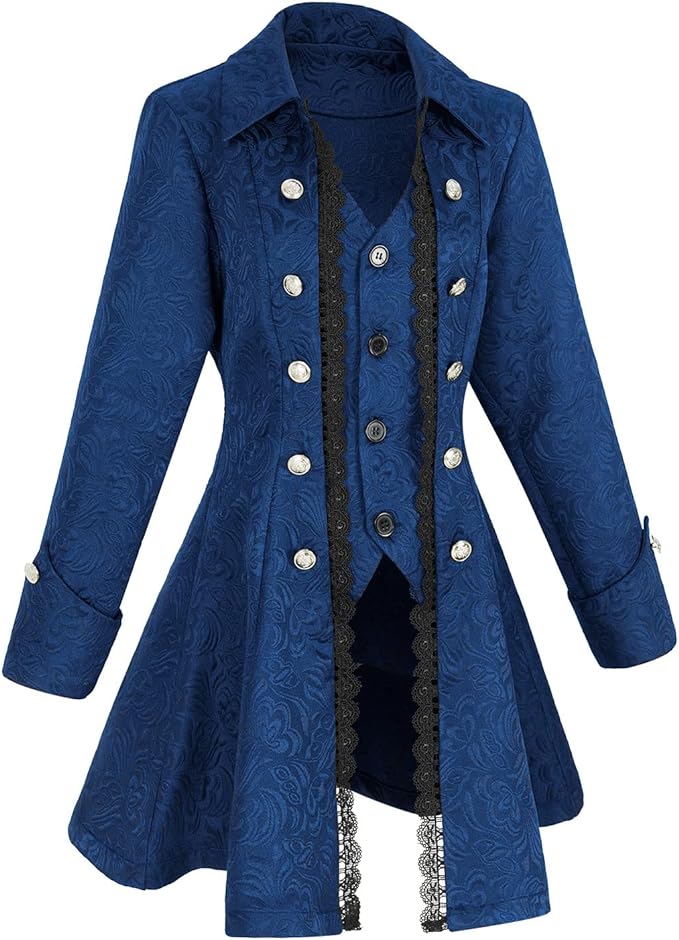 The elaborate buttons and the lace trim on this blue Victorian-style tailcoat are just wild.