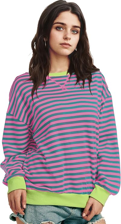 For a bold, youthful look, a striped sweatshirt with bright, contrasting colors adds personality to a classic preppy staple.